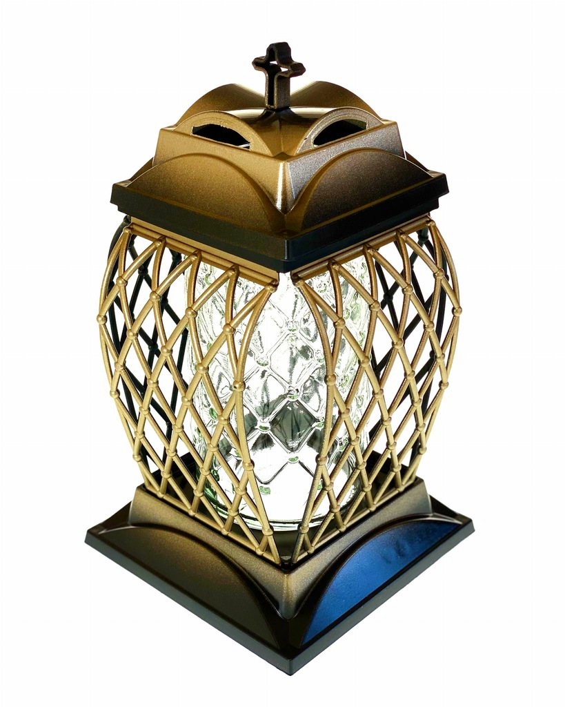 Dekoracyjny znicz nagrobny o subtelnej, delikatnej formie, wyposażony w podstawkę i złoty kapturek. Jego elegancki design oraz precyzyjne wykonanie sprawiają, że stanowi wyjątkowy symbol pamięci.