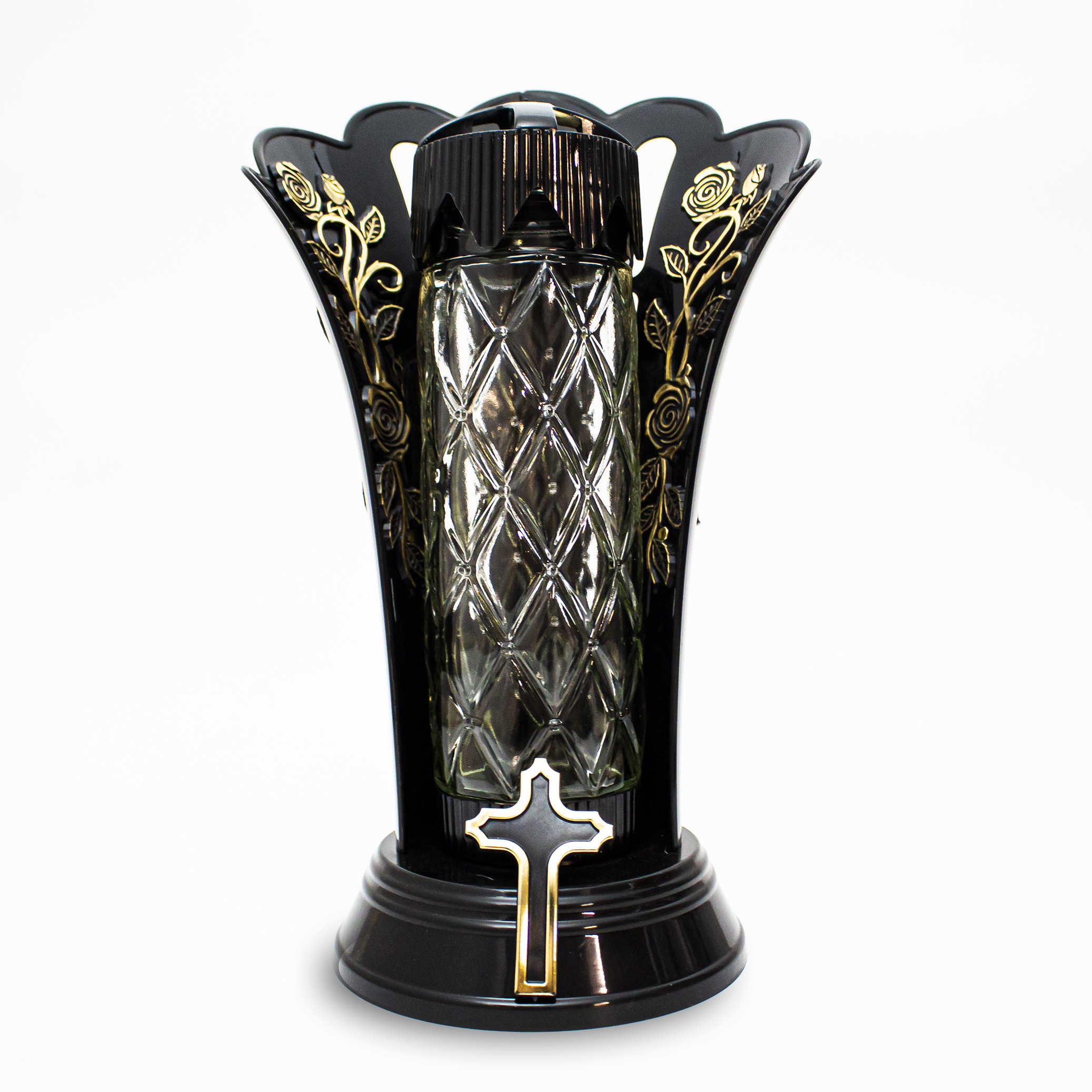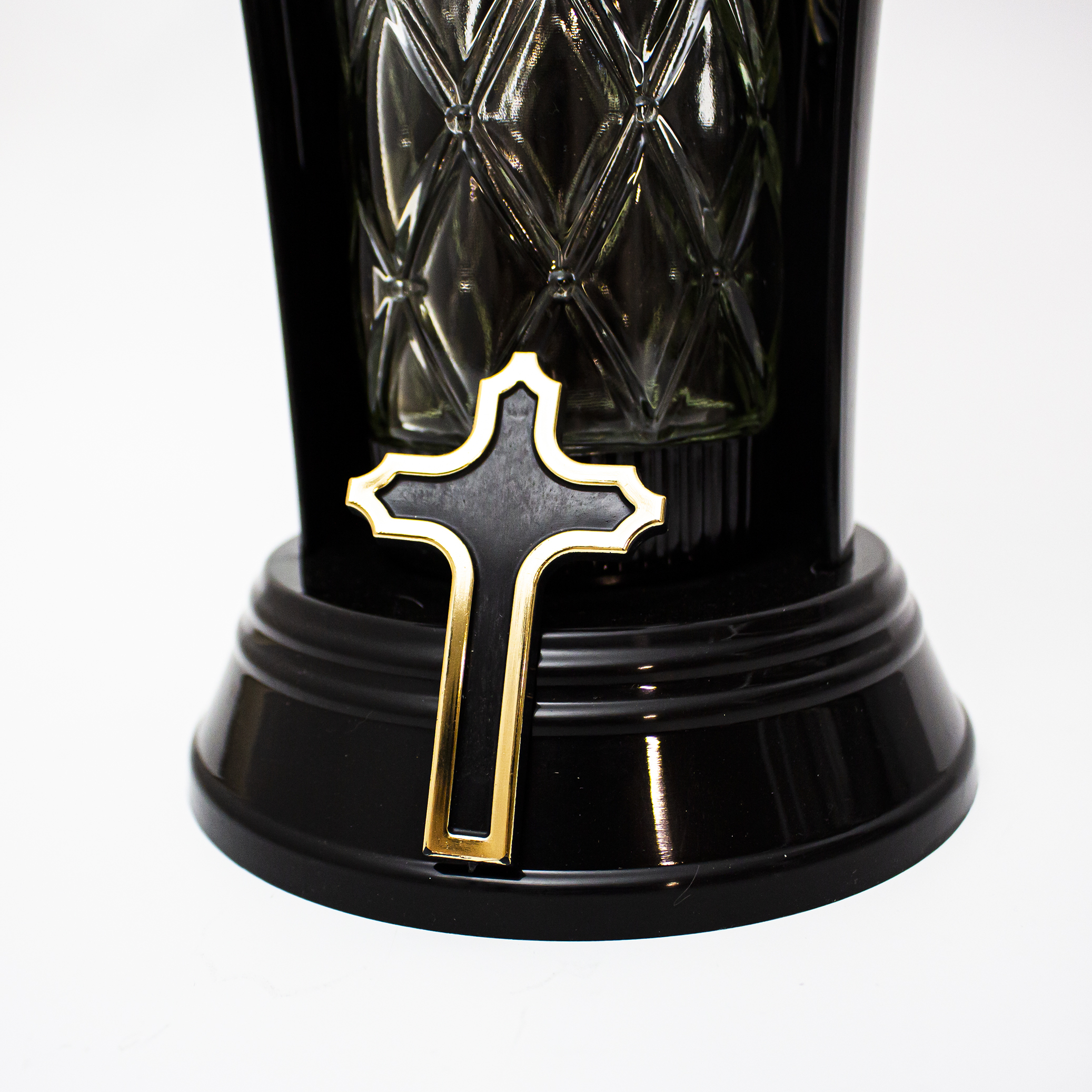 Dekoracyjny znicz nagrobny o subtelnej, delikatnej formie, wyposażony w podstawkę i złoty kapturek. Jego elegancki design oraz precyzyjne wykonanie sprawiają, że stanowi wyjątkowy symbol pamięci.