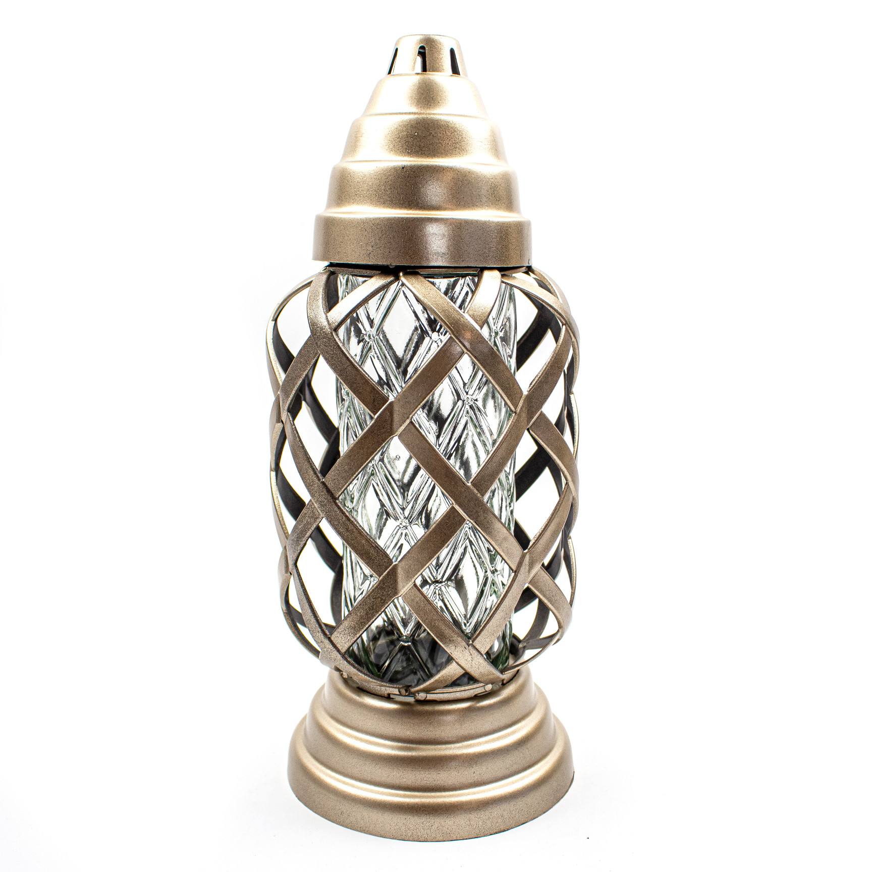 Dekoracyjny znicz nagrobny o subtelnej, delikatnej formie, wyposażony w podstawkę i złoty kapturek. Jego elegancki design oraz precyzyjne wykonanie sprawiają, że stanowi wyjątkowy symbol pamięci.