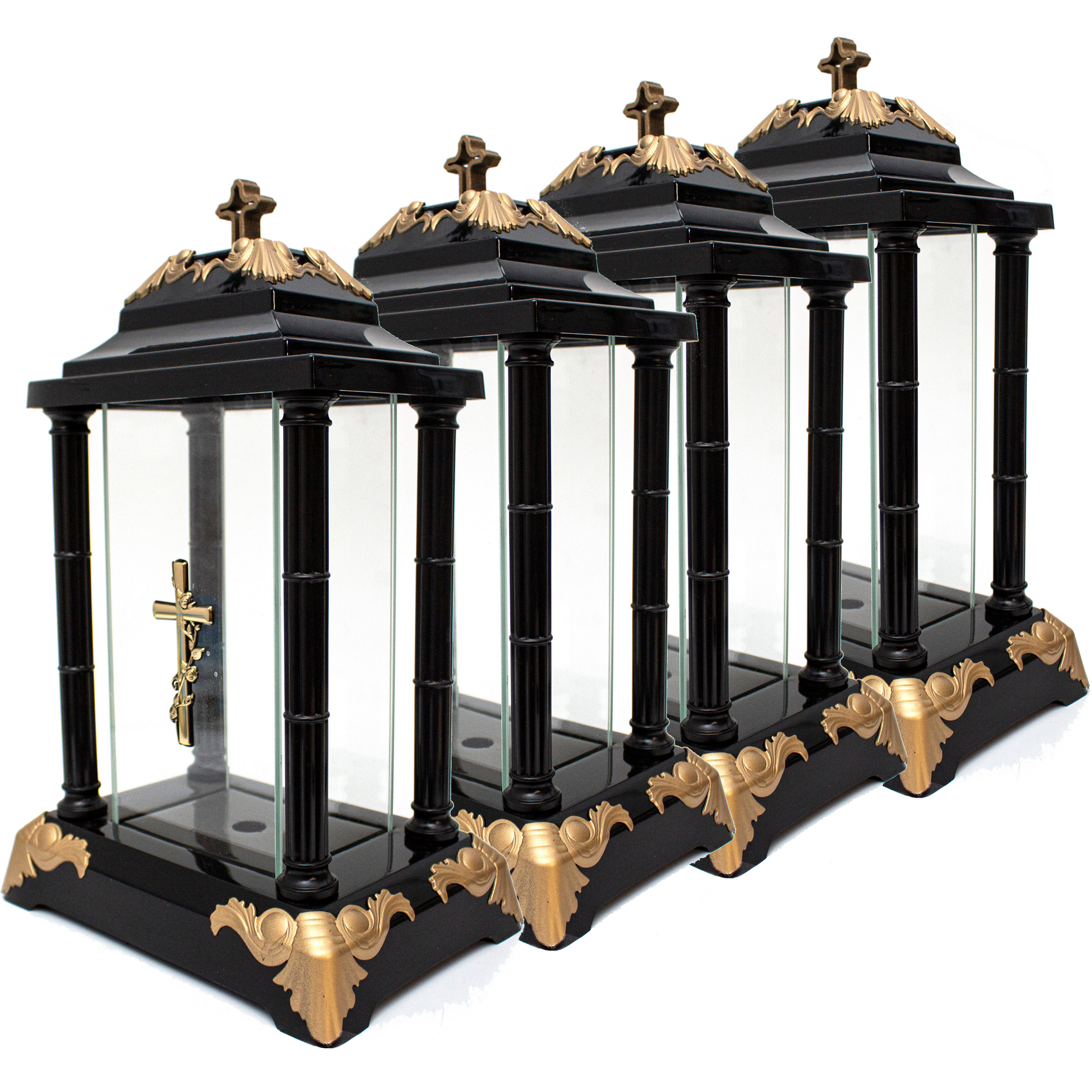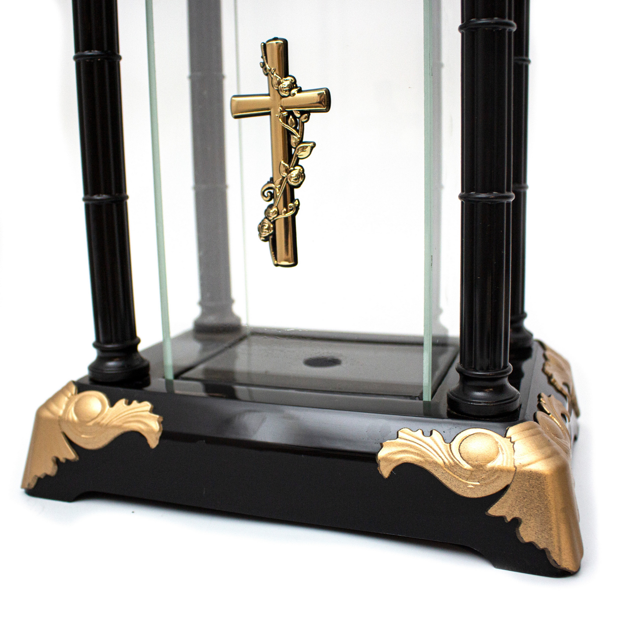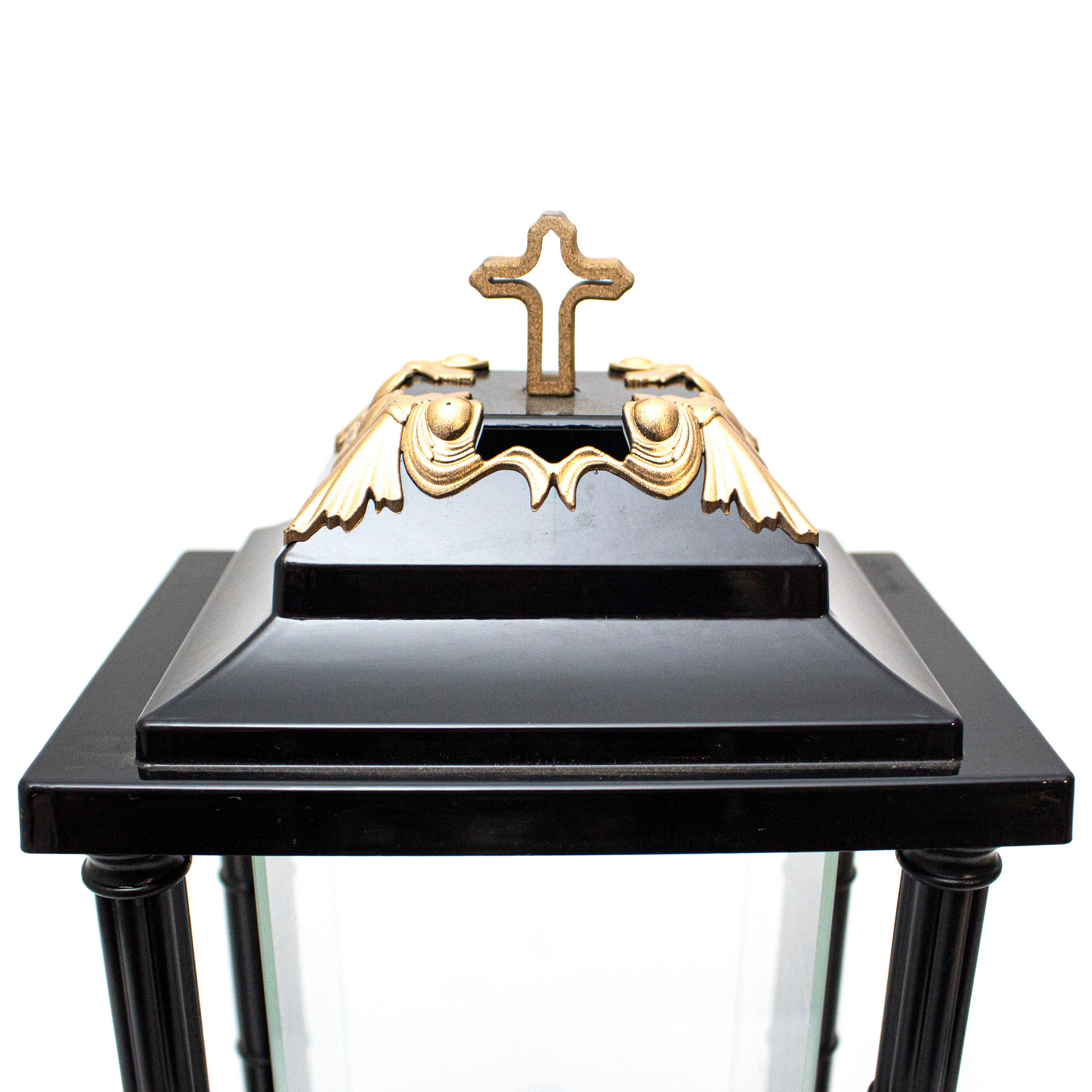 Elegancki znicz w formie latarni, wykonany z czarnego tworzywa połączonego ze szkłem. Na froncie umieszczony jest metalizowany krzyż z motywem róży, a całość uzupełniają srebrne zdobienia w rogach podstawy oraz krzyż na szczycie.